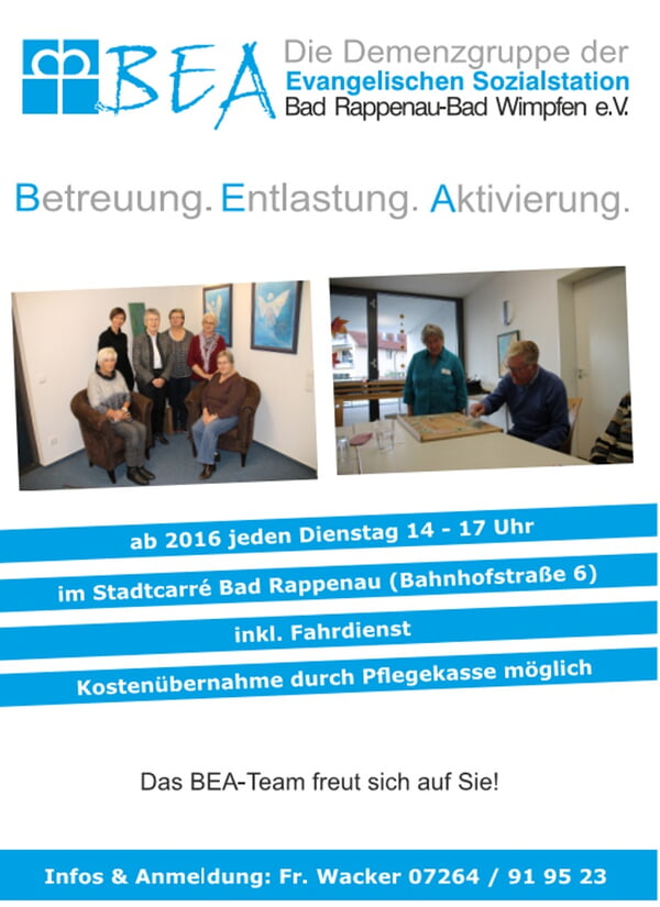 Betreuungsgruppe -BEA (Betreuen, Entlasten, Aktivieren) nennt sich das neue Betreuungsangebot für Demenzkranke, das ab dem 12. Januar 2016 wöchentlich von der Ev. Sozialstation Bad Rappenau-Bad Wimpfen in Zusammenarbeit mit der IAV-Stelle Bad Rappenau –Bad Wimpfen angeboten wird.